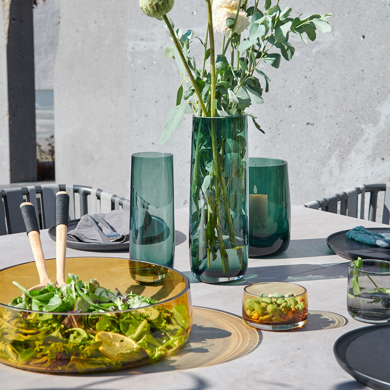 Името „Ajana“ означава „Красивото цвете“ на етиопски – и това се изразява перфектно в „Ajana“. Издухано, плътно оцветено стъкло, майсторски създадено в семпли линии, превръща вазите и купите в предмети с характер. Благодарение на здравината на материала и особено дебелата основа, тази колекция изглежда много елегантна и качествена.