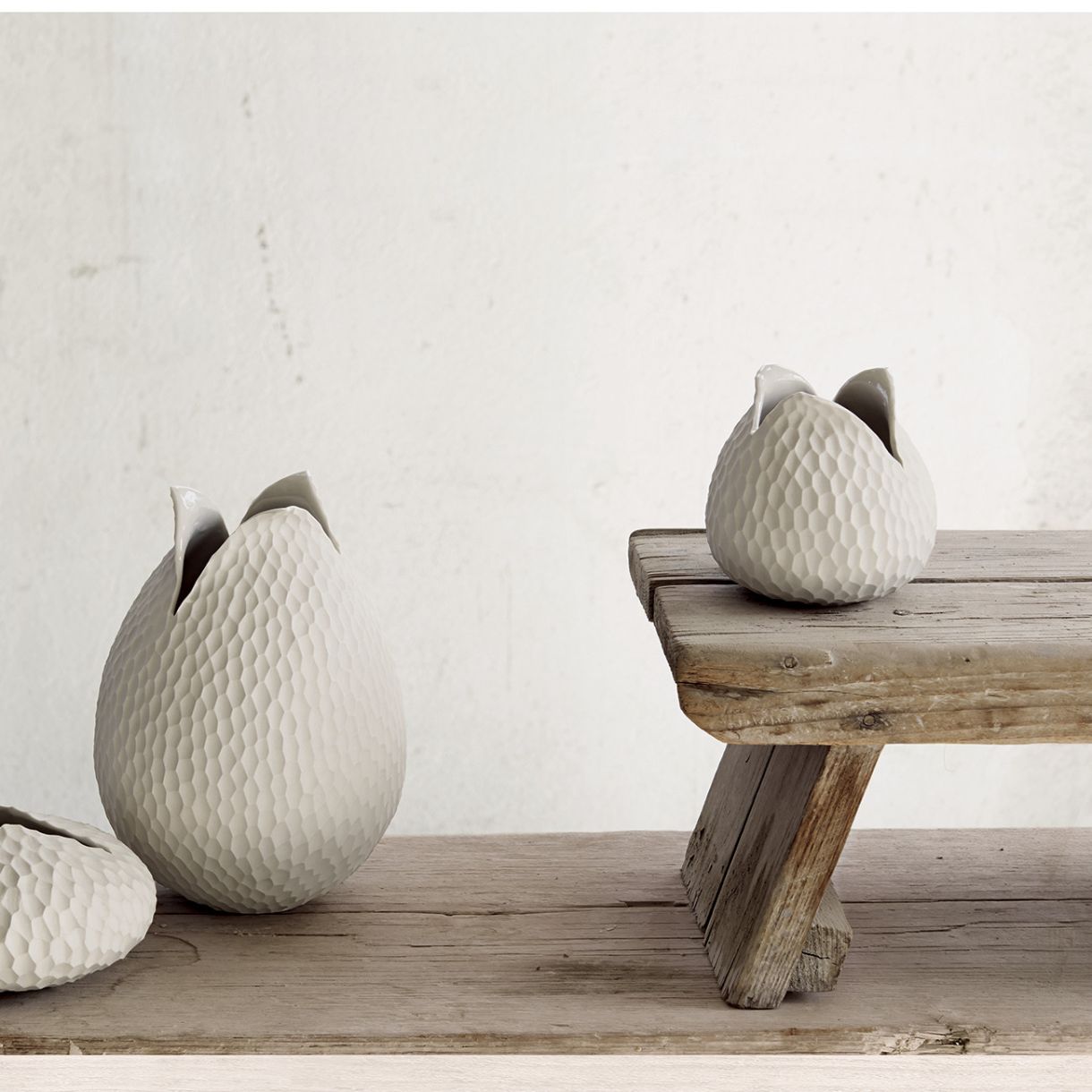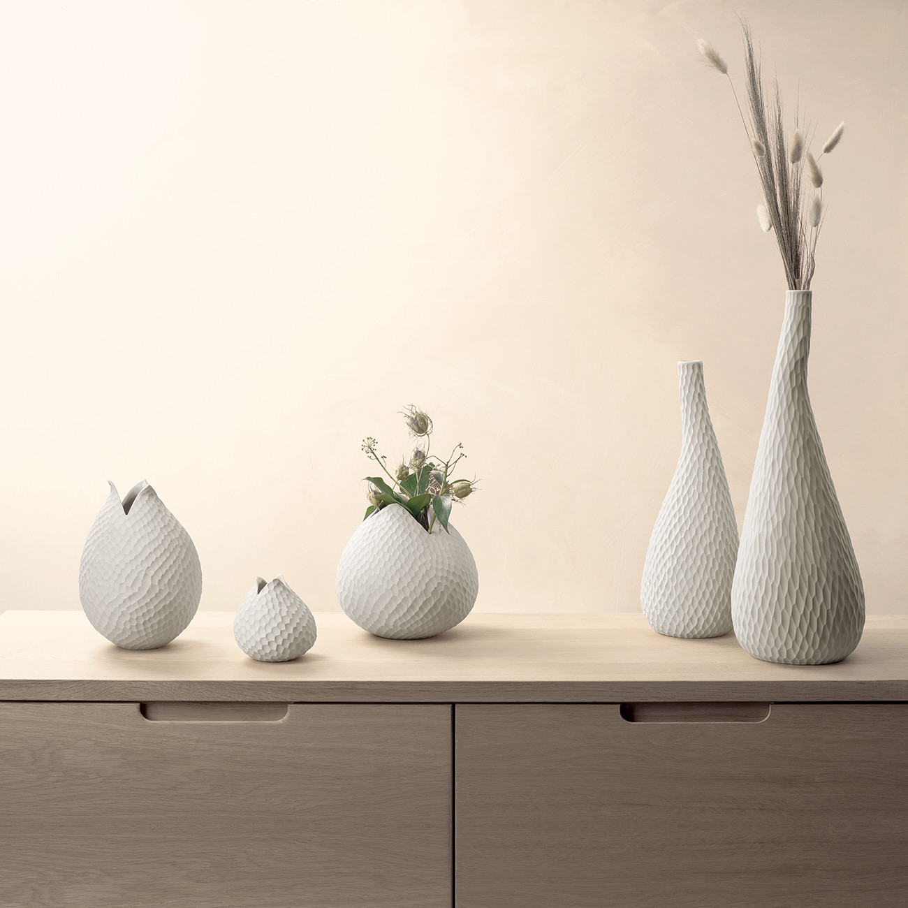 Carve е с фин разрез в средата на гърлото на всяка ваза. Пясъчният тон се съчетава както с приглушени, така и с ярки цветове, а матовата повърхностна глазура също допринася за пясъчния вид. Необичайният отвор напомня на пукнатини, позволяващи да се издигнат цветни лалета, впечатляващи цветове от лилия или просто зелени клони.