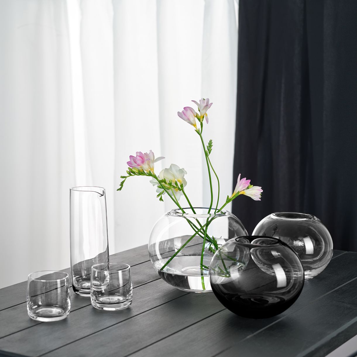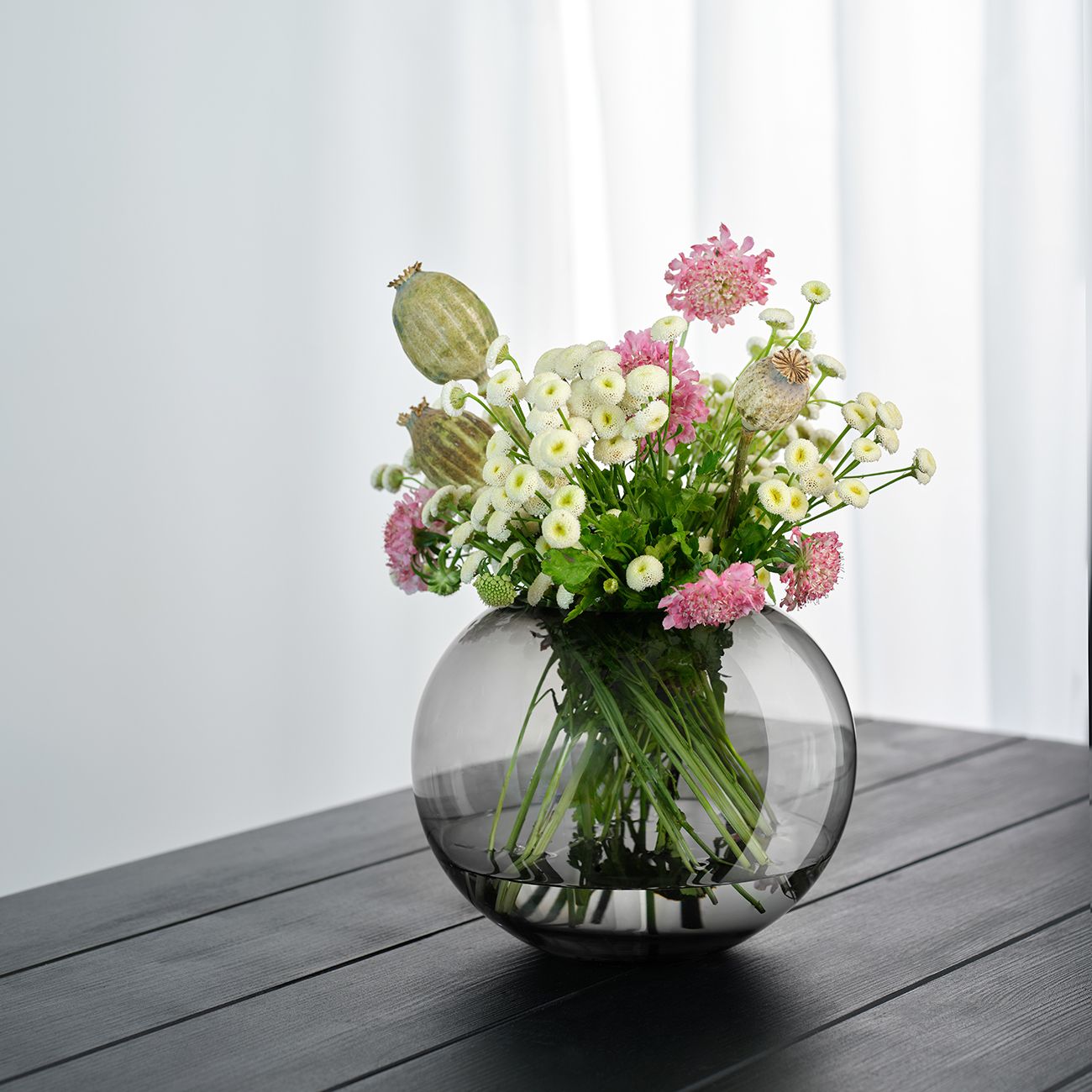 Издухано стъкло, майсторски създадено в сферична форма, превръща вазите в предмети с характер. Благодарение на здравината на материала и дебелата основа, тази колекция изглежда много елегантна.