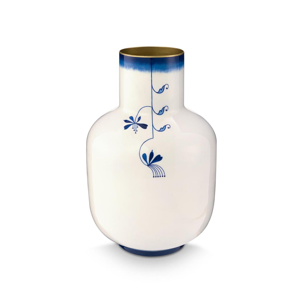 Тази метална ваза от колекцията Pip & The Blue Bird се откроява с уникален дизайн, в сини и бели тонове. Плавните цветови преходи създават успокояващ, почти мечтателен ефект, докато деликатните илюстративни детайли добавят нотка на поезия. Вазата е идеална за ефирен букет или като декоративен предмет, който блести дори без цветя.
