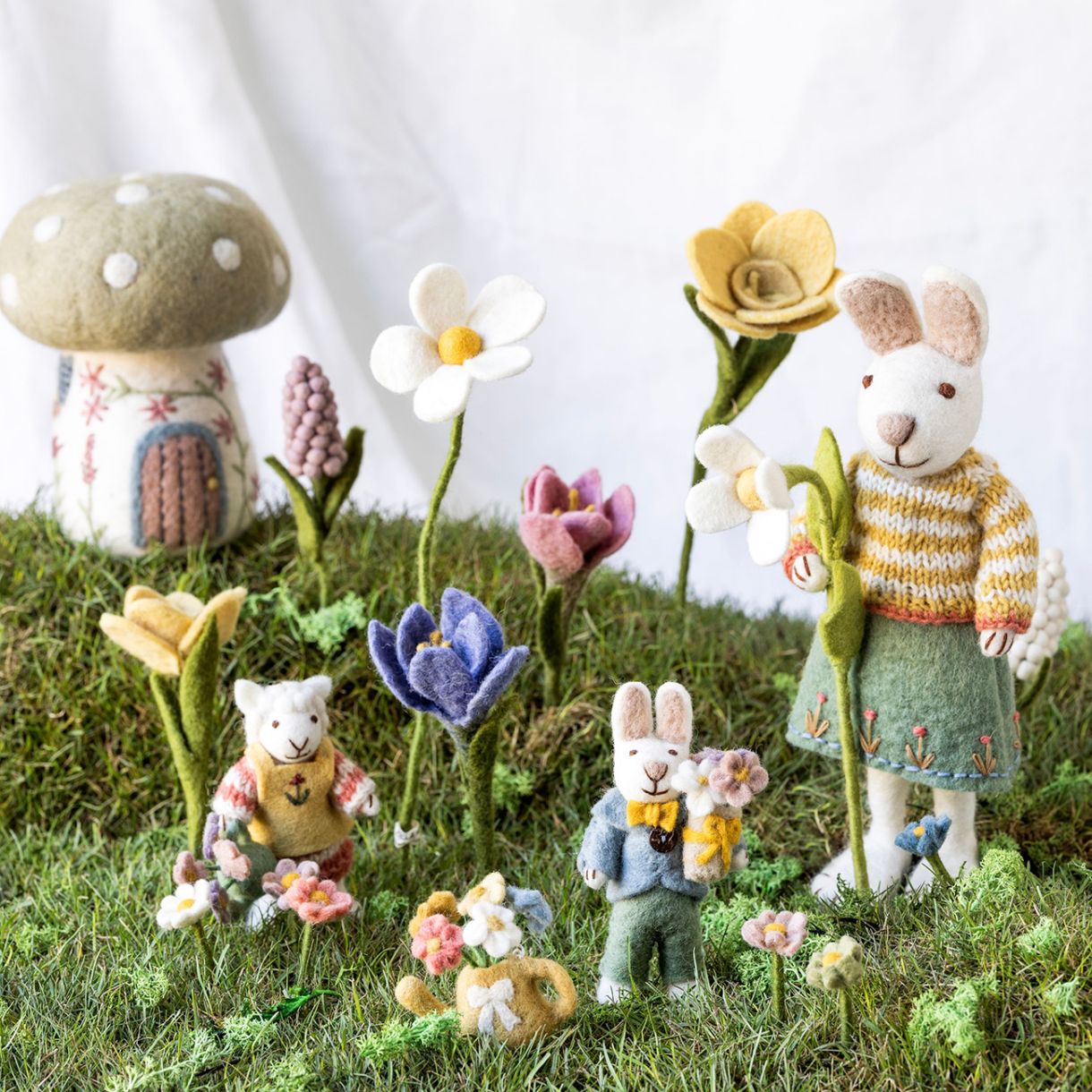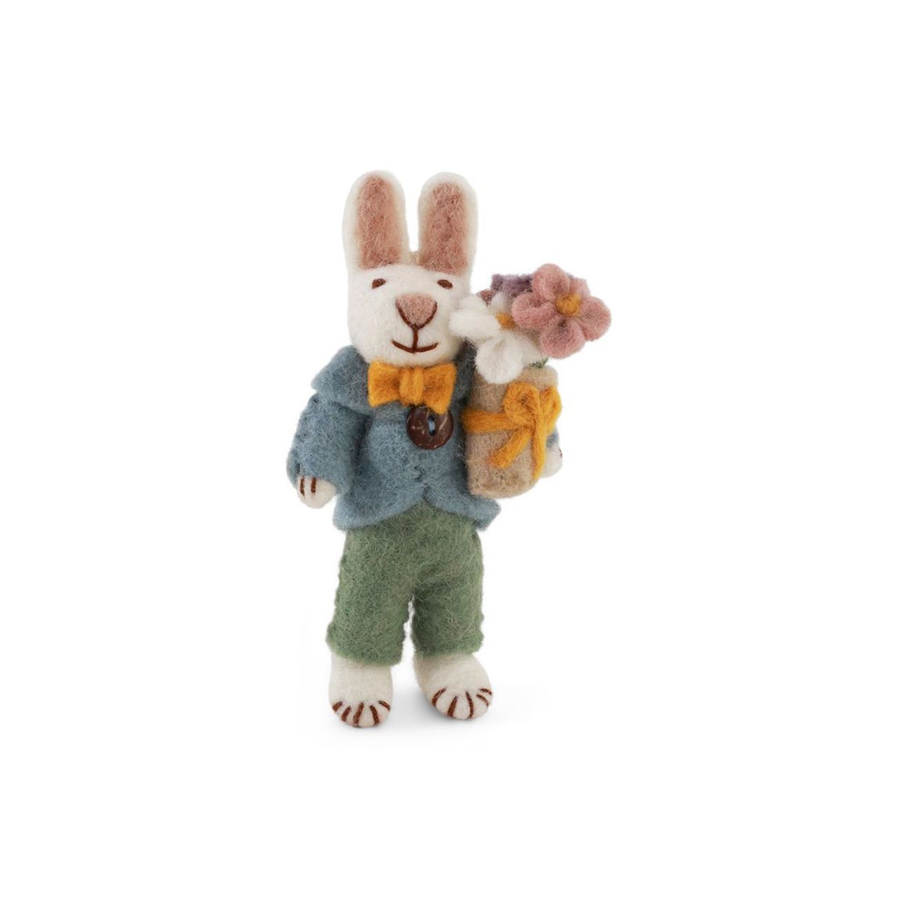 Това замислено зайче прекара целия следобед в събиране на малки филцови цветчета, само за да ги подари на някой специален. Малко срамежливо, но изпълнено със сърце, то носи радост на первазите на прозорците, рафтовете и кошниците с подаръци. Изработено на ръка в Непал, то е тихата звезда от семейството на великденските зайчета.