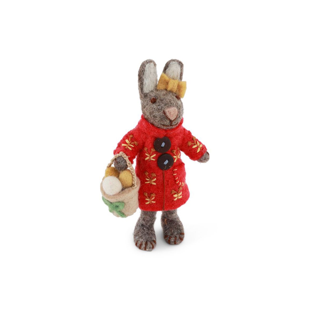 Навън все още е малко хладно, затова тя е облечена в мекото си палто, докато носи великденската си кошница, пълна с лакомства. Тя е от онези зайчета, които никога не идват с празни лапи и винаги знаят как да раздават радост. Ръчно изработена с грижа, тя е уютно докосване на чар във вашия сезонен декор.