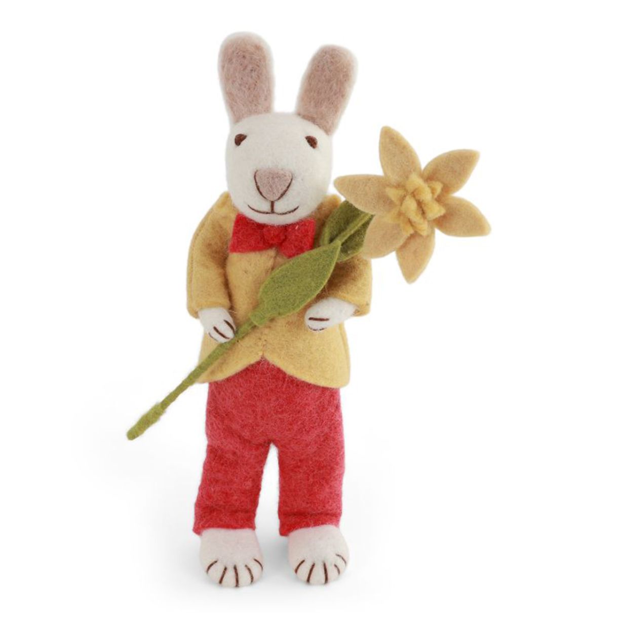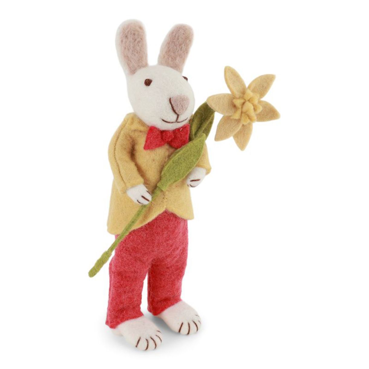 С жълто яке и ярък нарцис, това зайче излъчва топлина и чар. Прекрасна декорация, с която да посрещнете Великден в дома си.