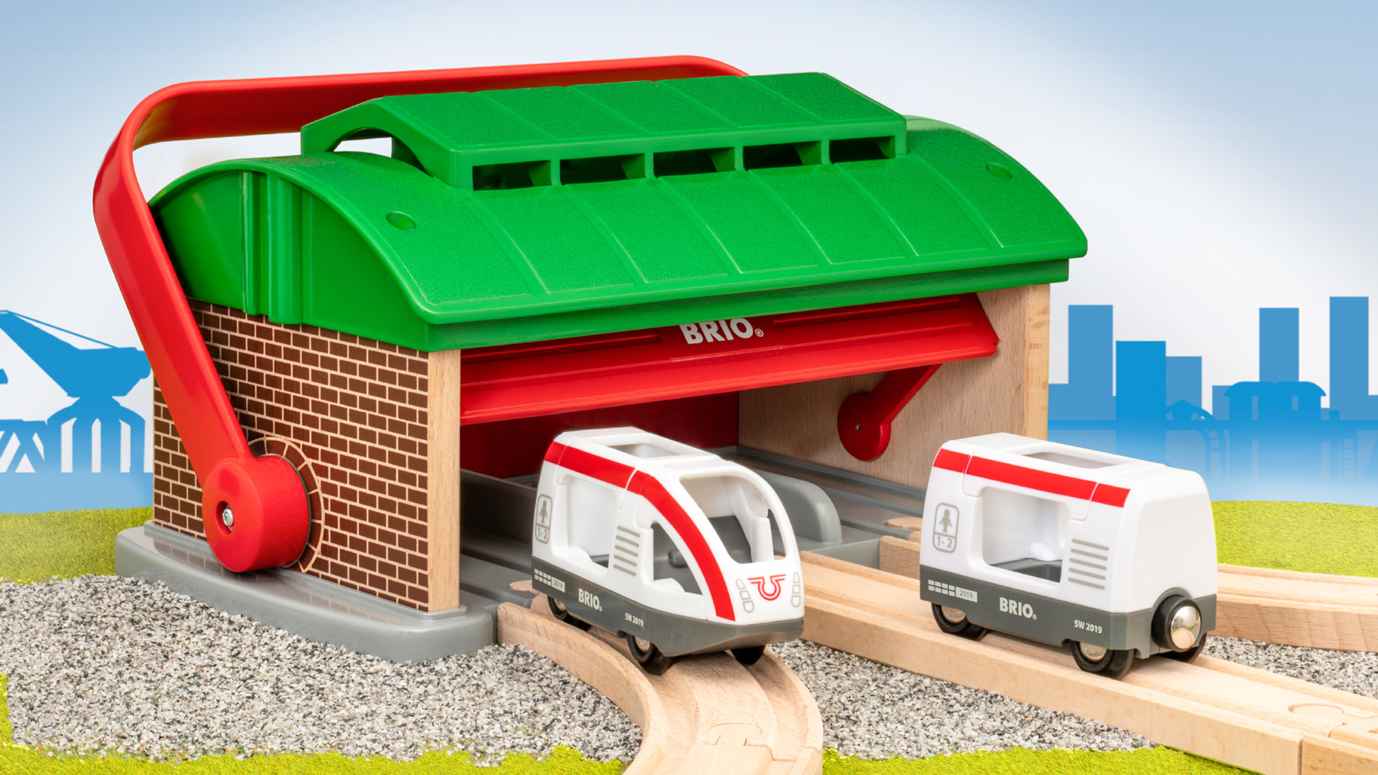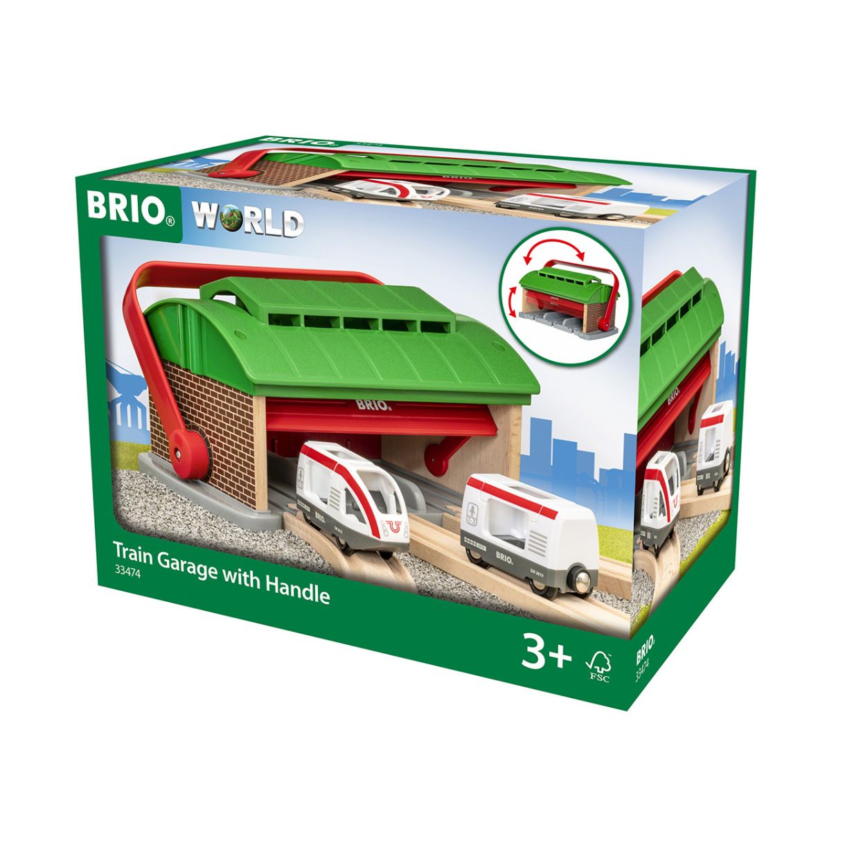 Гаражът за влакове с дръжка е чудесно допълнение към всяка железница BRIO World, като осигурява на влакчетата идеалното място за поддръжка и почивка. Вътре в гаража за ще откриете три места за паркиране, всяко със собствена релсова връзка, за да го вградите в съществуващия си железопътен макет, както и вече паркирани и чакащи за игра пътнически локомотив и вагон. Издърпайте назад голямата червена дръжка и вратата на гаража автоматично ще се отвори, осигурявайки лесен достъп до това, което се съхранява вътре. След като вратата се затвори отново, дръжката може да се застопори в изправено положение, което улеснява децата да пренесат гаража и съдържанието му към следващото приключение.