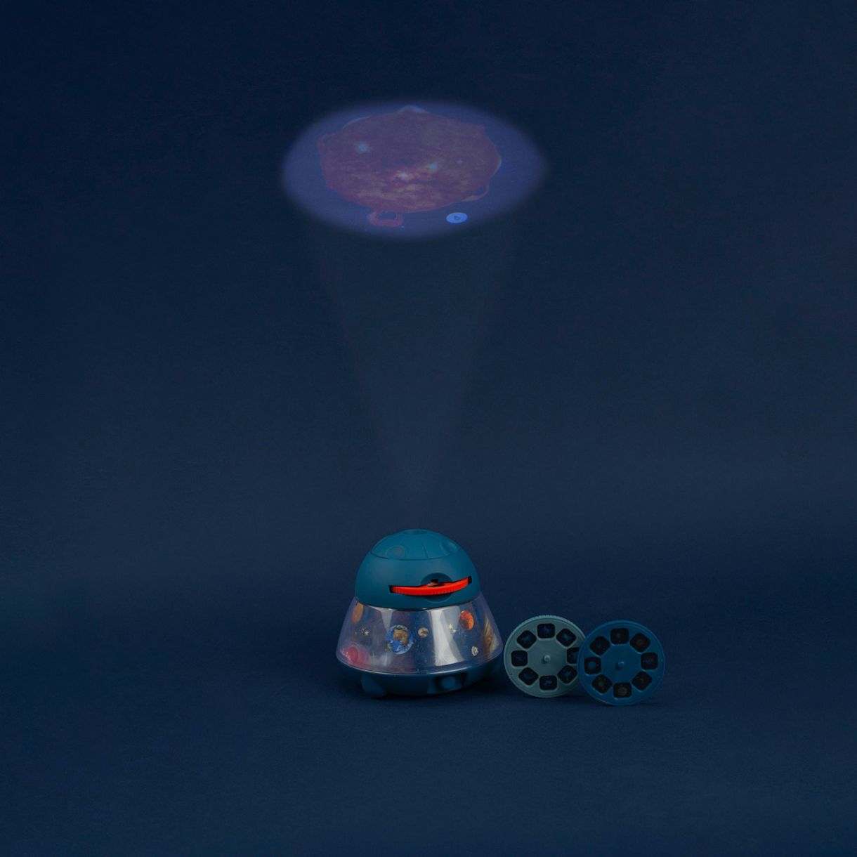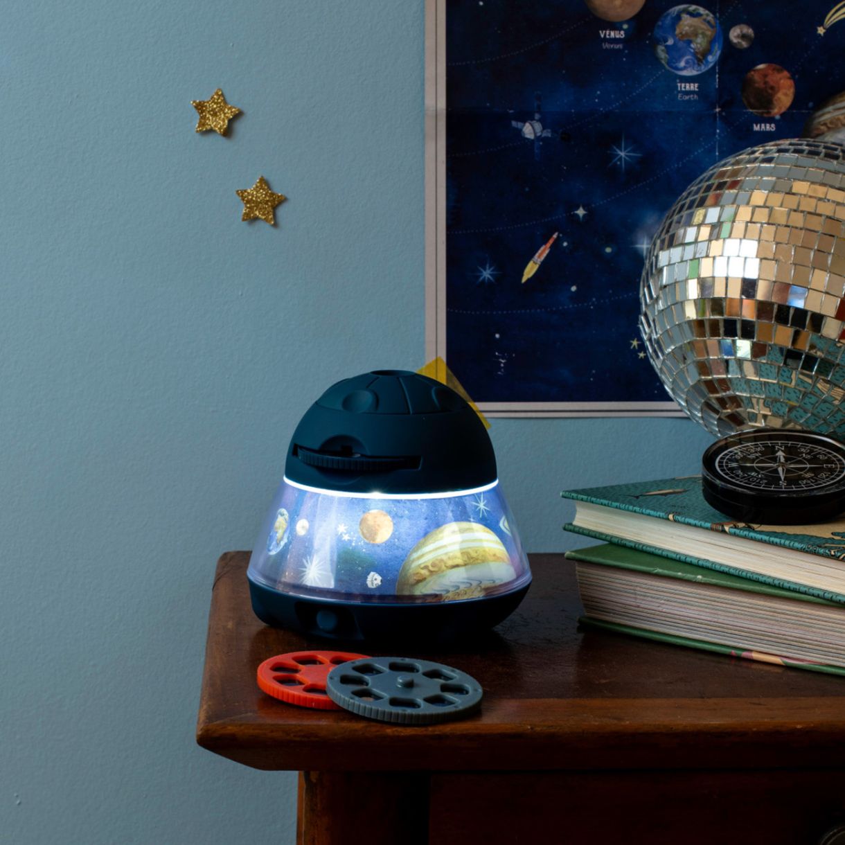 Открийте тайните на Вселената с големия космически прожектор от колекцията Le Jardin на Moulin Roty. Проектирайте планети, съзвездия и комети по стените или тавана и превърнете детската стая в истинско звездно небе. С помощта на 3 диска с по 8 изображения децата ще се впуснат в опознаване на космоса по забавен и вдъхновяващ начин. Прожекторът се зарежда чрез USB, а комплектът включва плакат и книжка с инструкции, които допълват преживяването.