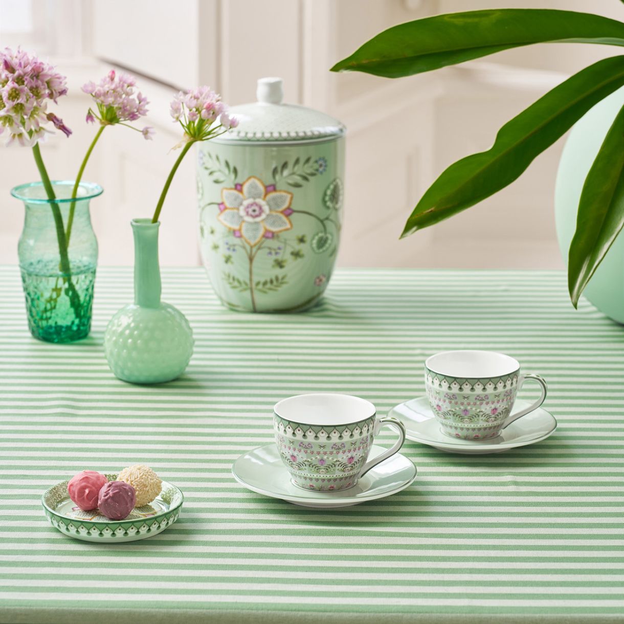 Чашите са декорирани с листа от лотос и глухарчета в пастелни нюанси. Цветята и грациозните папрати са разположени симетрично, придавайки на тези елегантни чаши модерен привкус. Чиниите са с красив лилав цвят. Lily & Lotus е първият сервиз за хранене в колекцията на Pip Studio, който може да се мие в съдомиялна машина и да се ползва в микровълнова фурна.