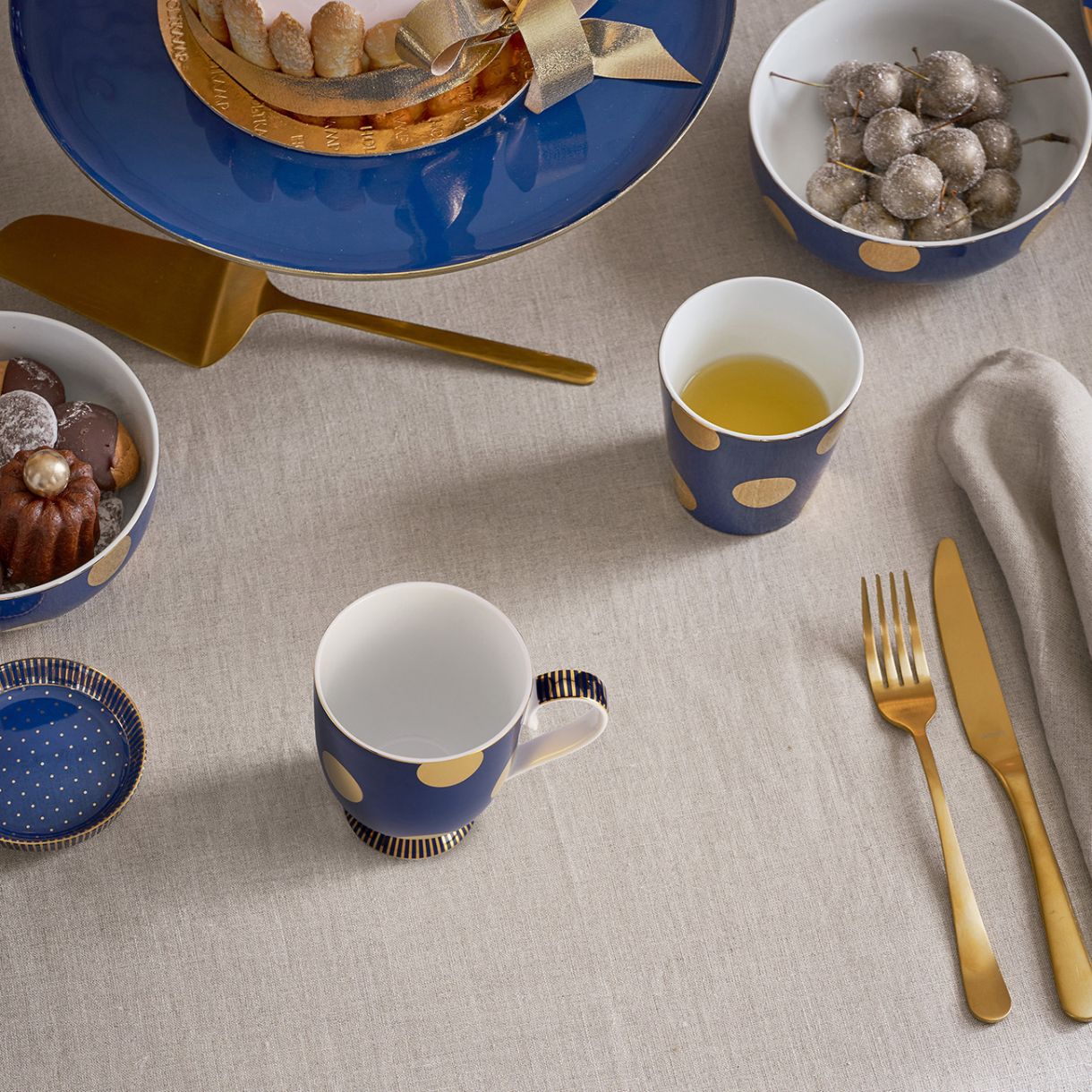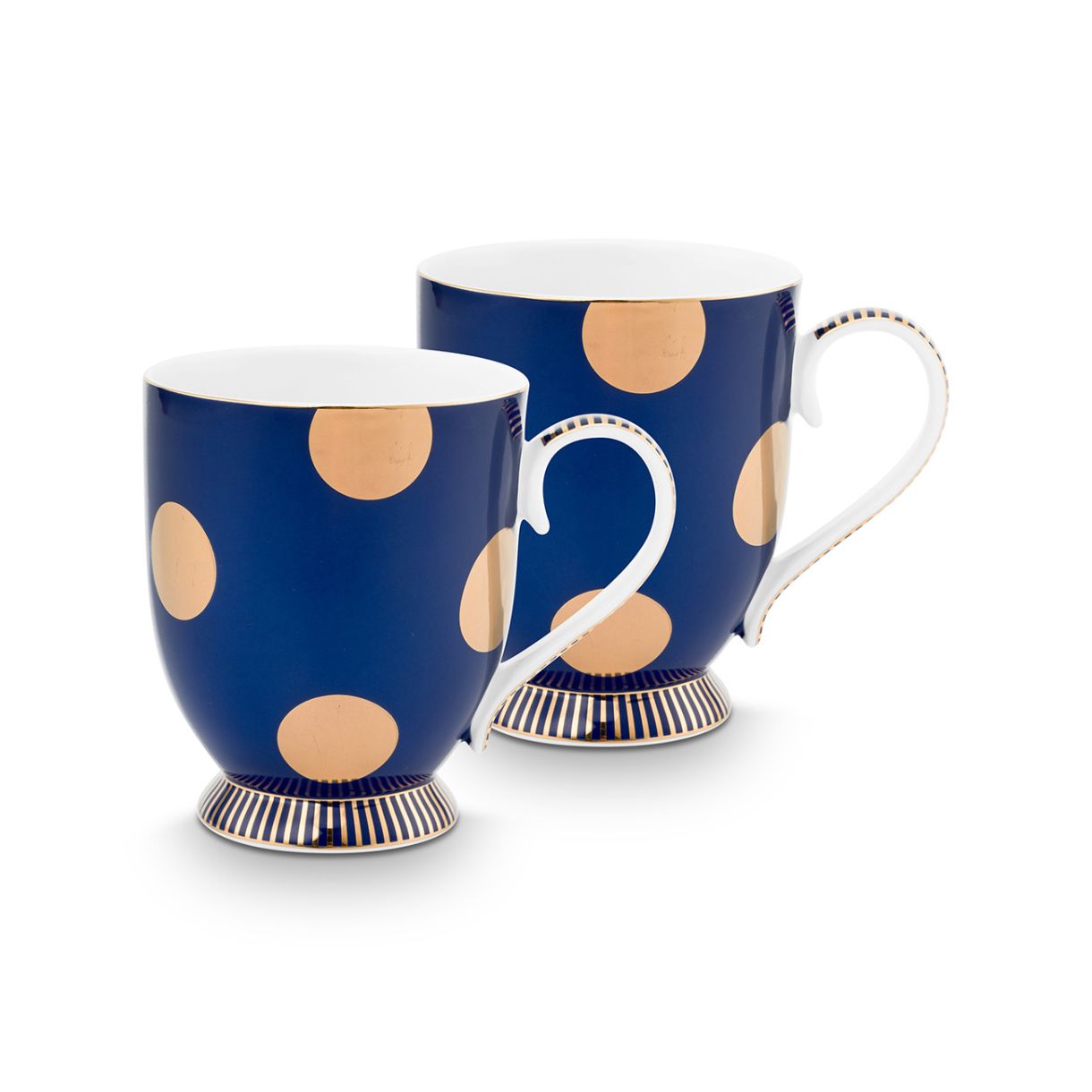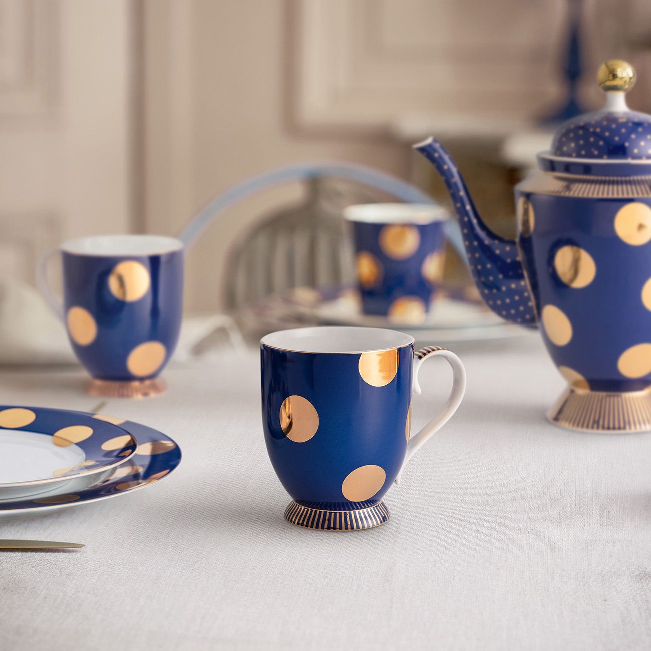 Комбинацията от големите лъскави златни точки със златната раирана основа придава на чашите вълнуващ обрат.