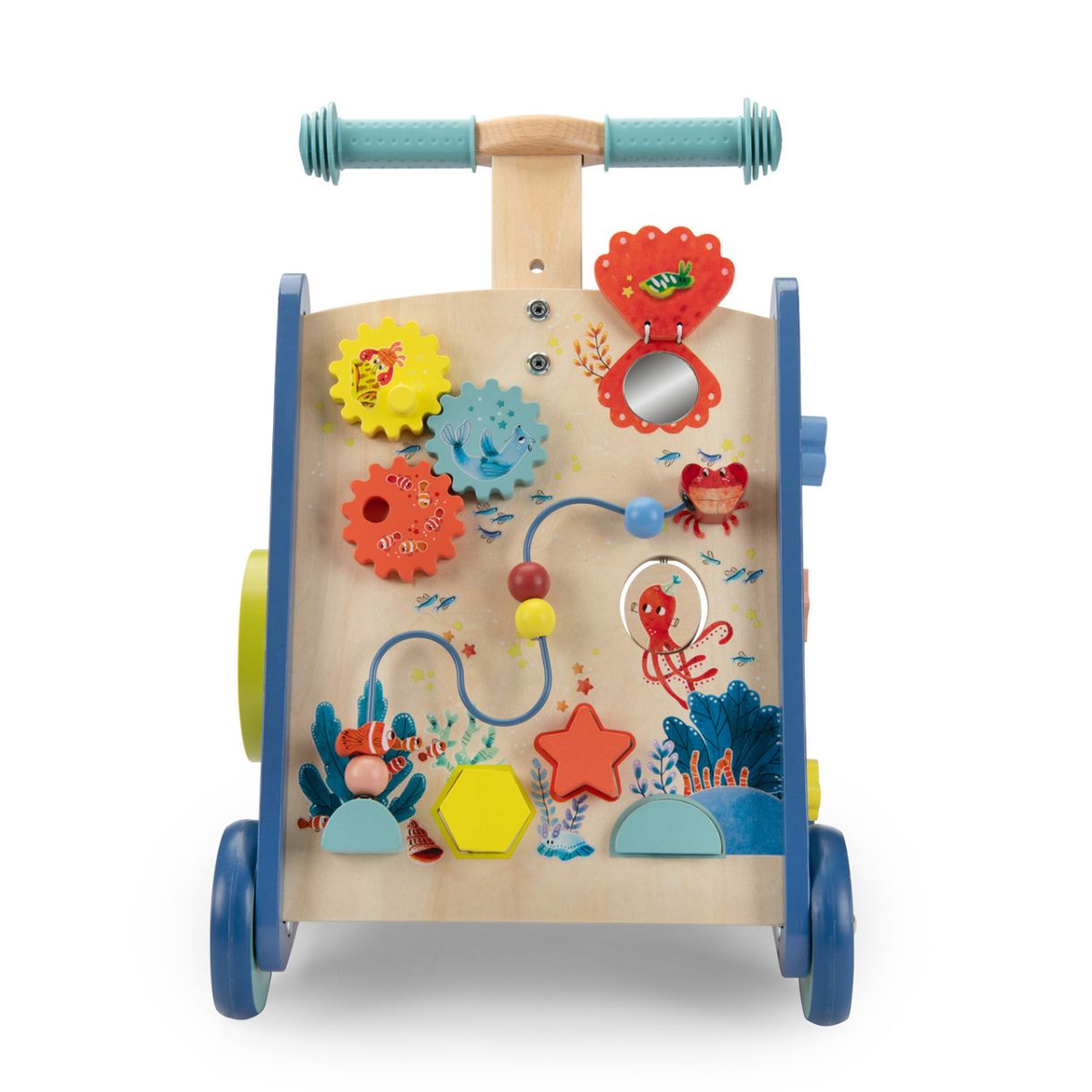 Открийте проходилката с активности от колекцията приключенията на Поли – прекрасна дървена играчка за прохождане, създадена за деца от 1 година. С нехлъзгаща се конструкция и дръжки с регулируема височина, тя осигурява стабилност и безопасност при първите стъпки на бебето. Облечена в цветовете на морските приключения на Paulie, тази проходилка кани детето да изследва подводния свят чрез 6 забавни и развиващи активности – лабиринт, зъбни колела, огледалце и още изненади. Идеалното съчетание между движение, игра и откриване!